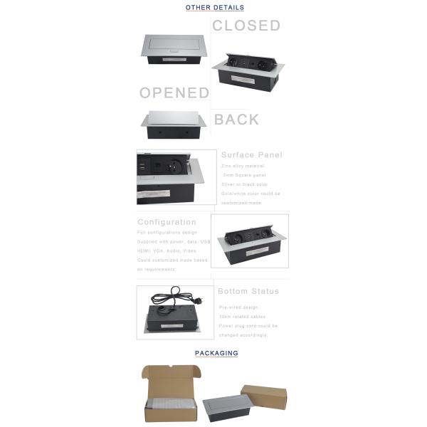 Conference tabletop hidden pop up socket, one modern office conference room multio-function AV power connector solutions. This socket normally contain the office high-quality projection audio video connected function for HDMI,VGA, Audio and Video.What's more, it normally supply with the universal power outlets which can fit for every difference power plugs.